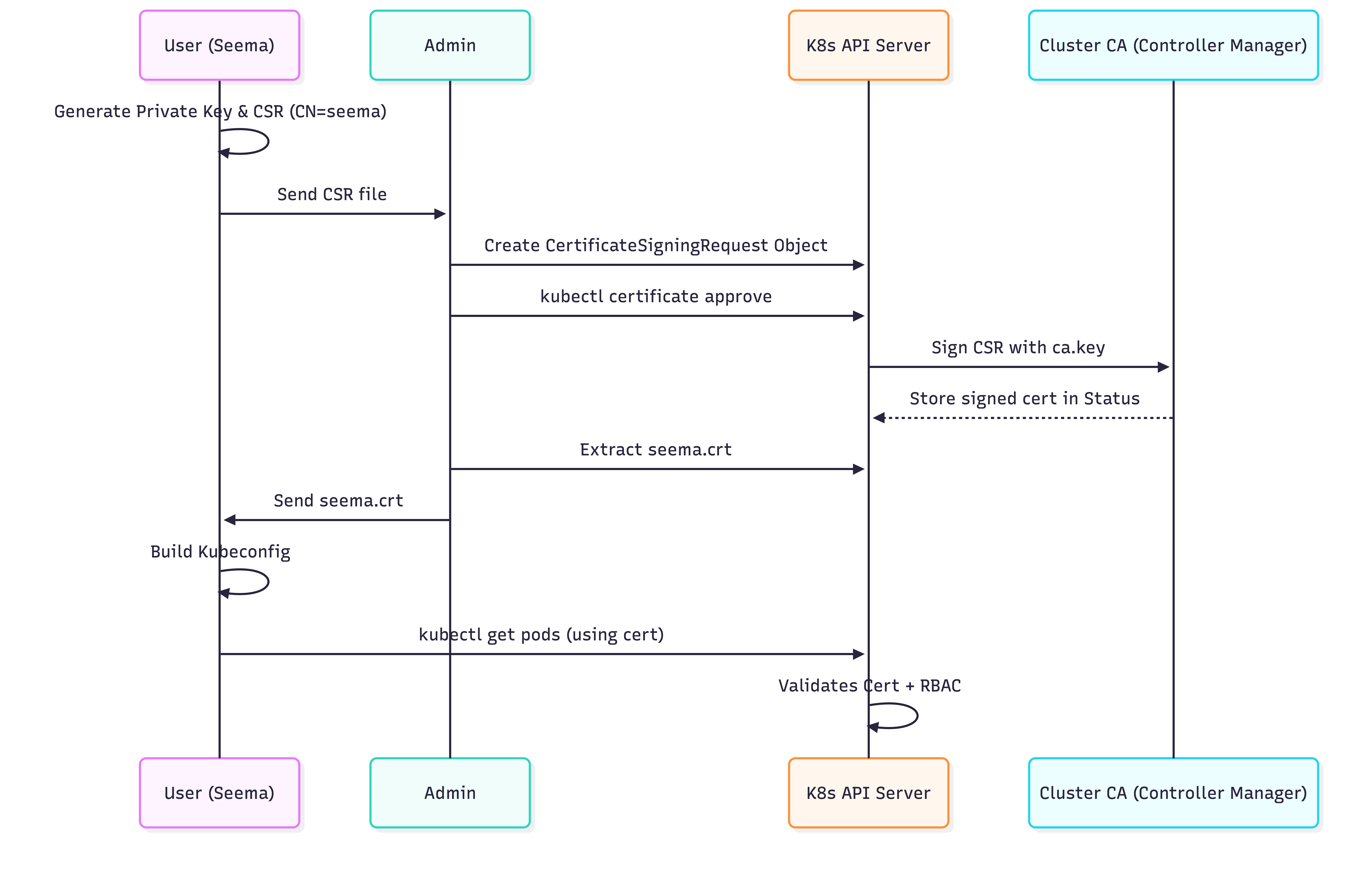 kubectl get csr user-seema-access - Approve: The Controller Manager signs the certificate using the Cluster CA.