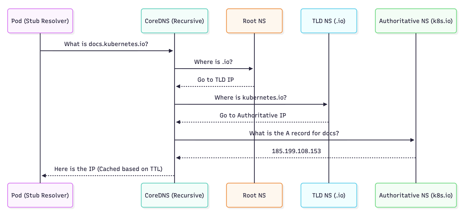 glibc) that sends the UDP/53 packet. - Recursive Resolver: (e.g., CoreDNS, Google 8.8.8.8, ISP). It performs the iterative walk of the DNS tree.
