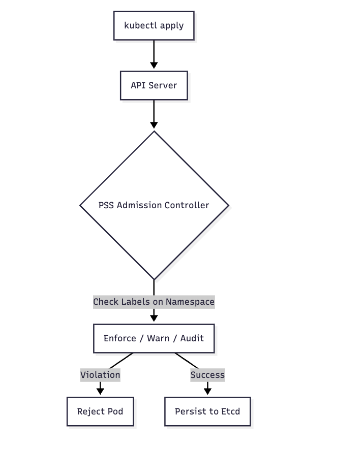 Since the deprecation of PodSecurityPolicy (PSP), Kubernetes uses Pod Security Standards (PSS). This is a built-in Admission Controller that validates Pods against three predefined profiles.