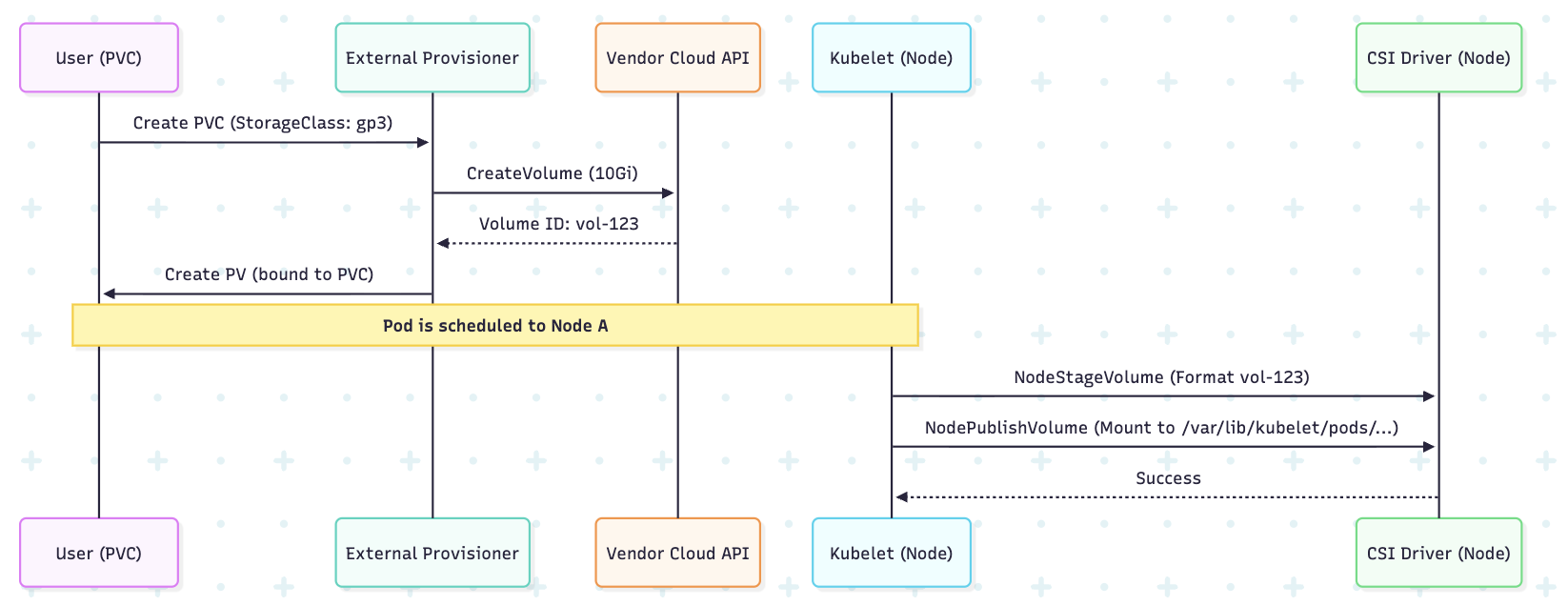 NodeStageVolume(formatting the disk) andNodePublishVolume(mounting the disk into the Pod's path).